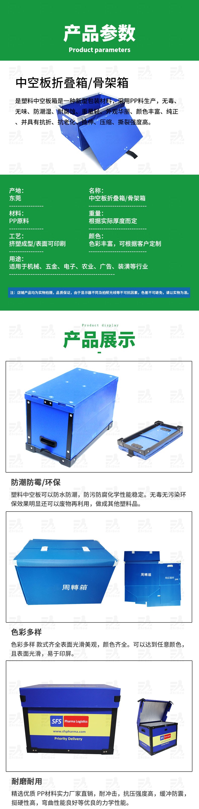 產(chǎn)品特性:顏色豐富、堆疊方便、防水、防腐,質(zhì)量輕,抗沖擊,抗老化,抗拉伸,抗壓縮等性能,承載能力大,周轉(zhuǎn)使用    次數(shù)高,適用于重型產(chǎn)品包裝,中空板材質(zhì)可實現(xiàn)完全回收再利用,綠色環(huán)保,符合ROSH標準。